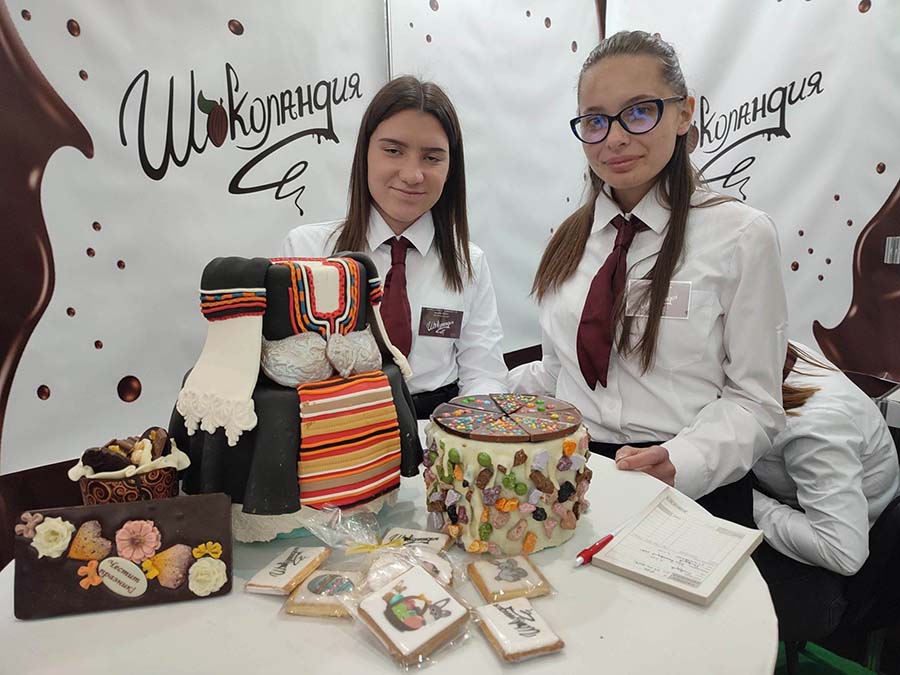 Оригинална торта бе изложена на щанда на ПГ „Велизар Пеев“ – Своге. В сладкото изкушение и престилката, и пафтите, и ризата са измайсторени така, че да се получи автентична народна носия. Нестандартната идея е на учениците от специалност „Кетъринг“. А връстниците им, които изучават икономика, се заели с мениджмънта. Няма нищо особено в рецептата – блатове и крем на няколко етажа, обясняват младите предприемачи и добавят, че останалото е фондан и въображение. Другото им предложение е торта от разноцветни бонбони, бял и фин млечен шоколад.
