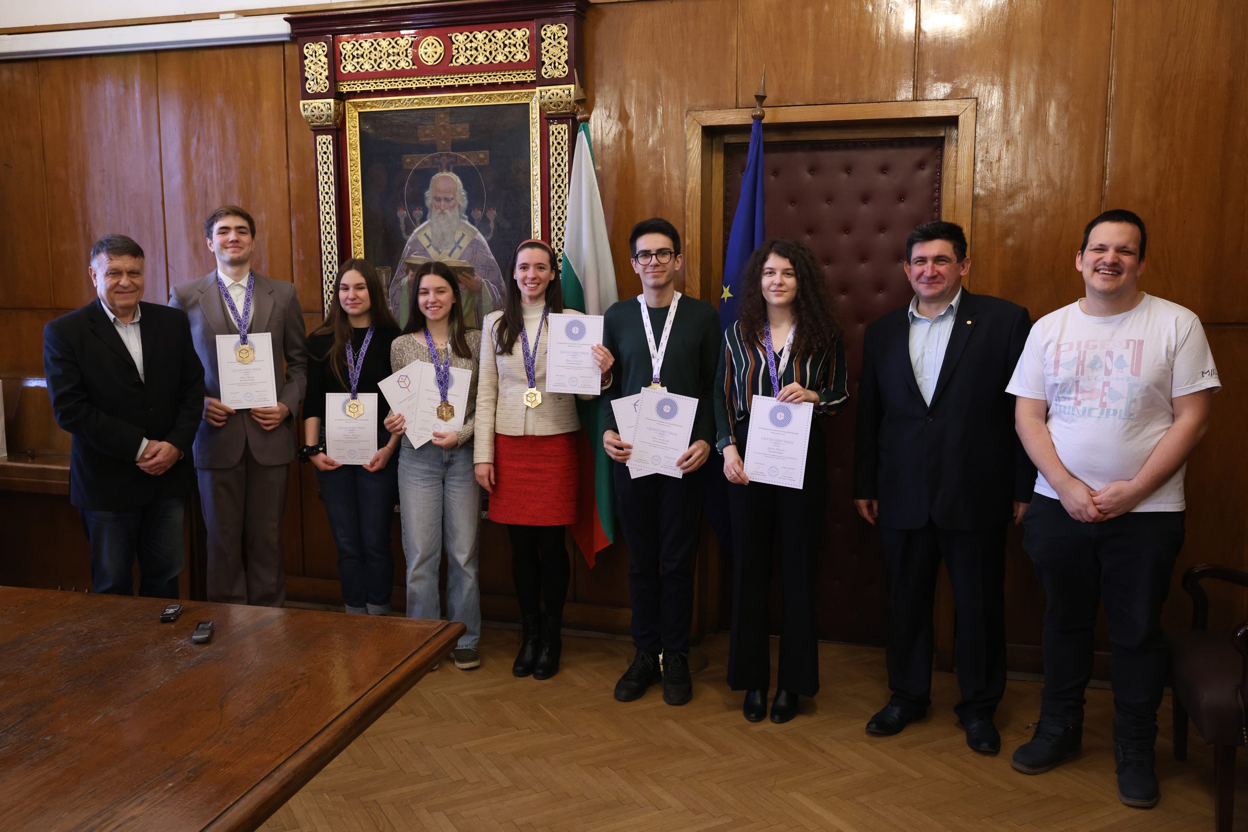 Златните медали и грамотите на българския отбор, който спечели първо място и Grand First Prize на Международния турнир на младите математици – 2023 г., бяха връчени на официална церемония от ректора на Софийския университет „Св. Климент Охридски“ проф. д-р Георги Вълчев, предава БТА.