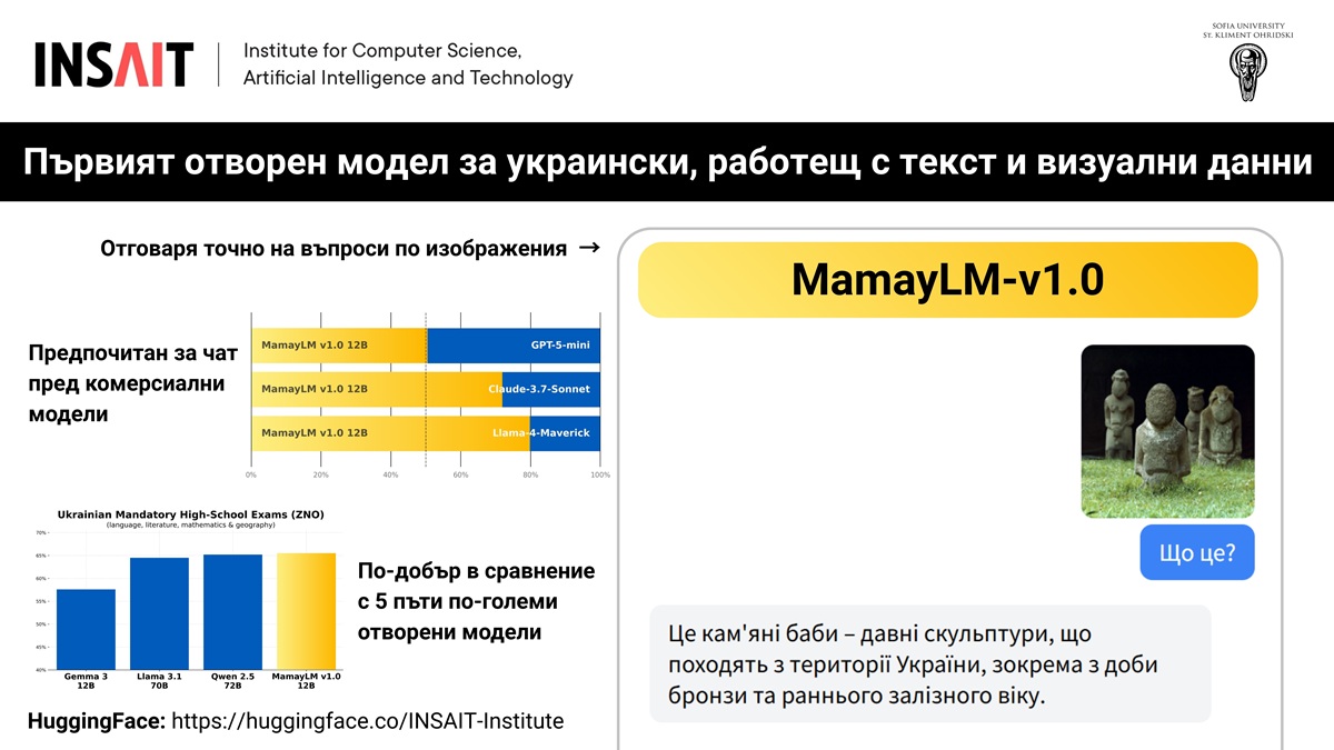 Институтът за компютърни науки, изкуствен интелект и технологии (INSAIT) към Софийския университет „Св. Климент Охридски“, представи MamayLM v1.0 – първия отворен и практичен модел за украински език, който може да работи както с текст, така и с визуални данни, съобщиха от научно-изследователската организация.