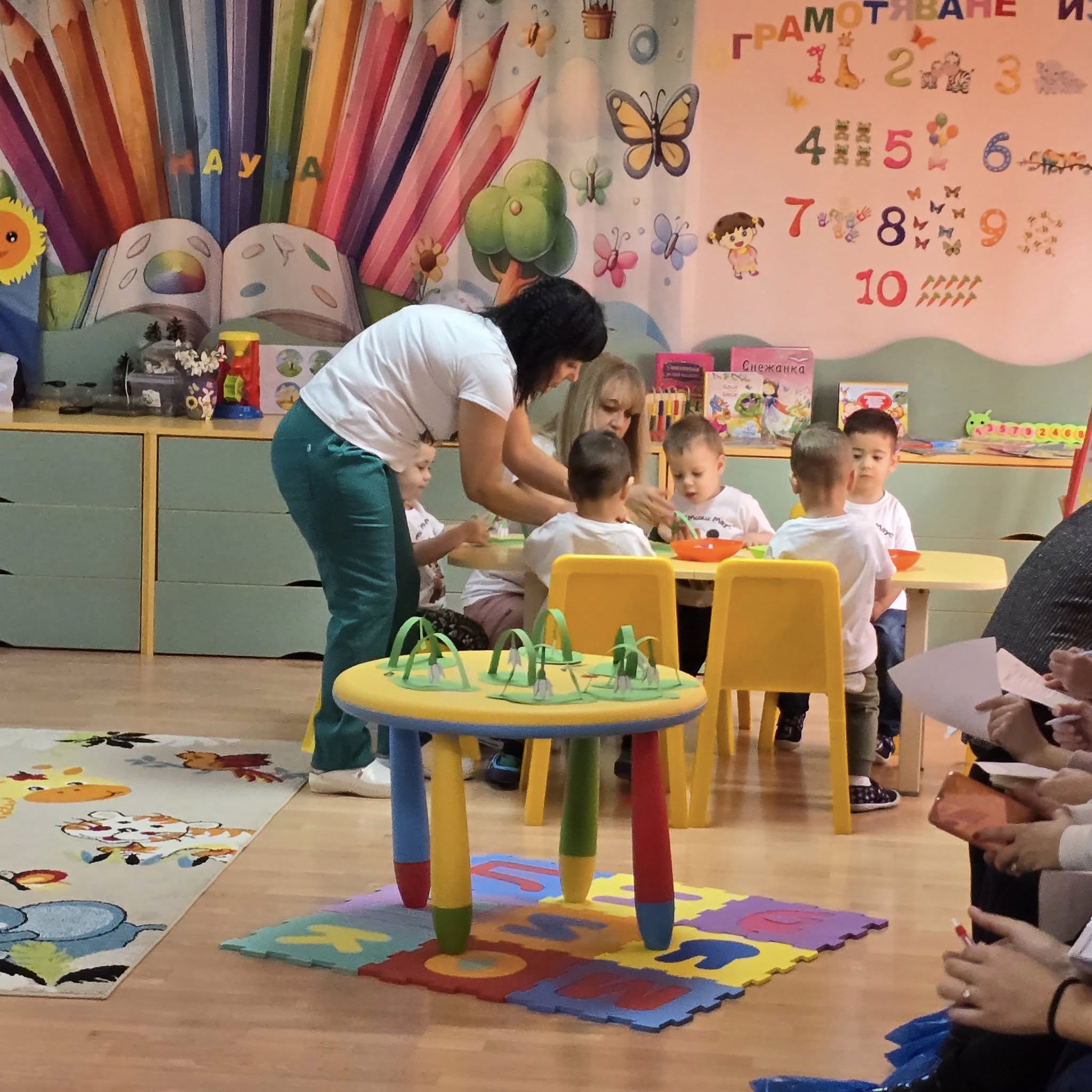 След това децата отиват в тематичните центрове –образователни пространства, специално подредени от медицинските сестри за конкретната тема. Там малчуганите играят различни игри или извършват различни дейности – апликират, рисуват и много други.