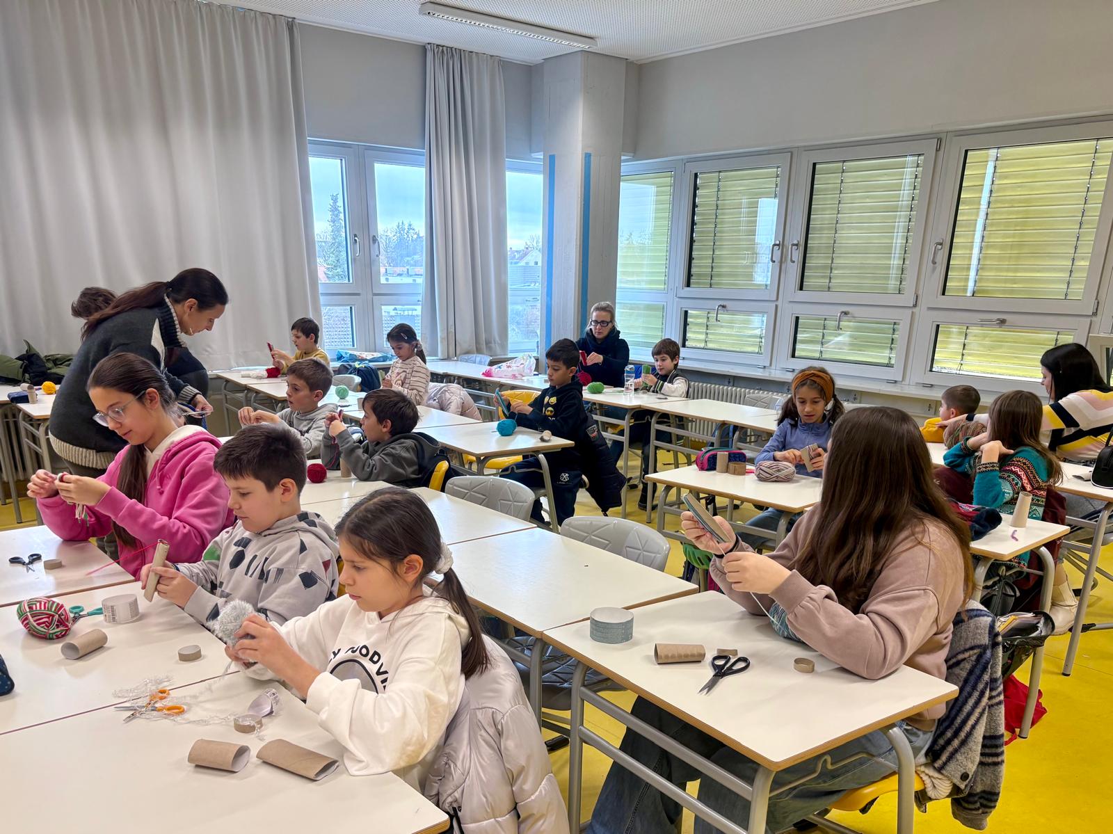 Българското училище не пропуска и традиционната коледна работилница, в която децата с много ентусиазъм изработват коледни шапчици от прежда и сътворяват празнична атмосфера, изпълнена с усмивки и творчество.