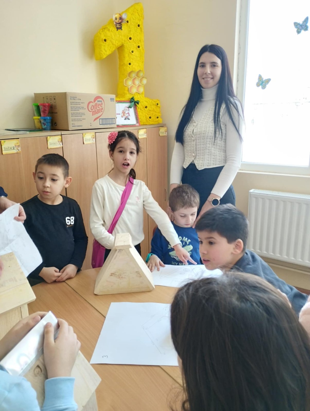 Седмокласниците сами правят три чертежа на къщички за птици, прилагайки знанията си по математика. Те работят под насоките на своята учителка по математика Цветомира Петкова.