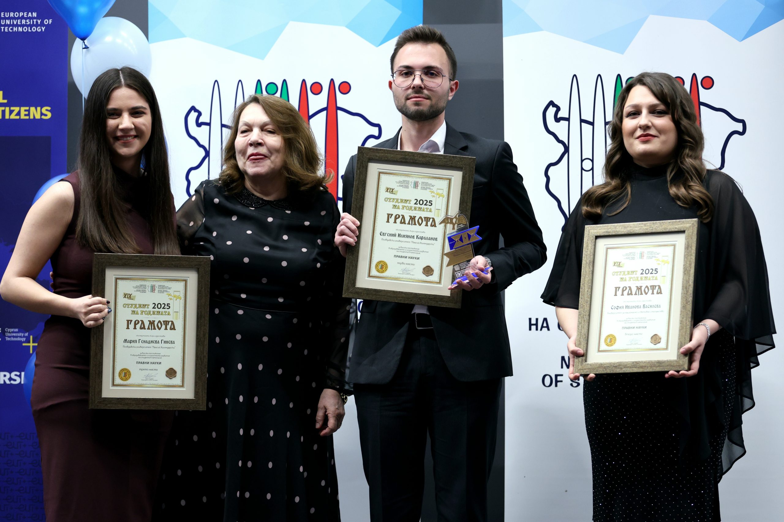 Отличието в категория „Правни науки“ заслужи Евгений Караланов от Пловдивския университет „Паисий Хилендарски“. Той го получи от проф. Мария Славова, главен редактор на двуезично сп. „Правен преглед“.