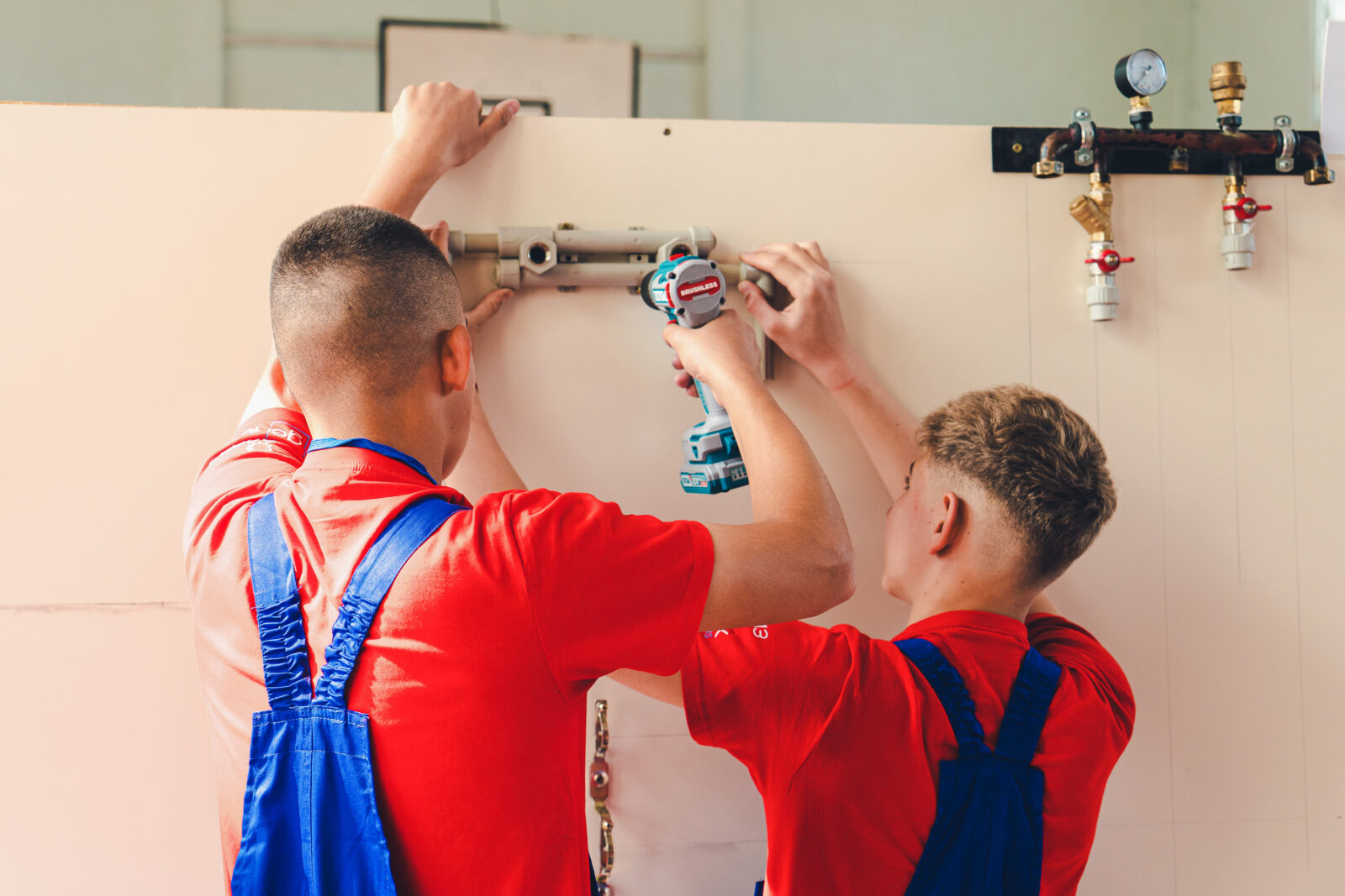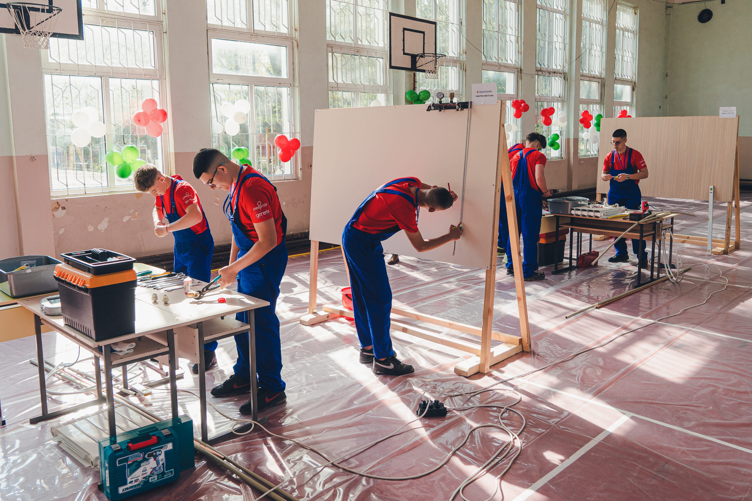 Гимназистите демонстрират знания и практически умения чрез изграждане на елементи от газова, санитарна и отоплителна инсталация, работейки в екипи по трима души.