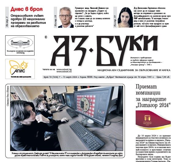 <h4><img class="size-medium wp-image-119989 alignleft" src="https://azbuki.bg/wp-content/uploads/2024/03/azbuki-10-2024-213x300.jpg" alt="" width="213" height="300" />Актуалните теми в броя:</h4> - Отрасловият съвет одобри 22 национални програми за развитие на образованието - Дебати за новите учебни програми - Те трябва да са рамкови, насочени към индивидуалните потребности на ученика и към изграждане на умения, очерта новата визия министър Галин Цоков - BgGPT влезе във всекидневието - Институтът INSAIT пусна първия достъпен изкуствен интелект на български език - Удължава се срокът за конкурса на „Аз-буки“ за научна статия - В подкрепа на българистиката - МОН облекчава правилата за избор на преподаватели в чужди университети - Знаем в науката, можем в професията: Софийската професионална гимназия „Княгиня Евдокия“ привлича ученици с модерна база и атрактивни специалности - Премиерът акад. Николай Денков при връчването на наградите „Студент на годината“: „За да бъдеш студент, който ще успее в живота, не е важно само да си вземеш изпитите с петици и шестици, а и да участваш в различни дейности“ - Д-р Десислава Гергинова обяснява как могат да се създадат нови методи за откриване и доказване на фалшифицирането на различни храни чрез ЯМР метаболомика. Тя избира да изследва пчелен мед и вино от различни географски региони, тъй като тези продукти са едни от най-честите за фалшифициране храни <a class="fp-embed" style="max-width: 100%;" href="https://73fc06f9.flowpaper.com/102024/" data-fp-width="400px" data-fp-height="300px">Вестник „Аз-буки“ – брой 10/2024 г.</a><script async defer src="https://cdn-online.flowpaper.com/zine/3.8.3/js/embed.min.js"></script> <a href="https://azbuki.bg/wp-content/uploads/2024/newspaper/%D0%B2.%20%D0%90%D0%B7-%D0%B1%D1%83%D0%BA%D0%B8%2C%20%D0%B1%D1%80.%2010%2C%202024%20%D0%B3..pdf" target="_blank" rel="noopener">Изтеглете</a> броя на вашeто устройство.