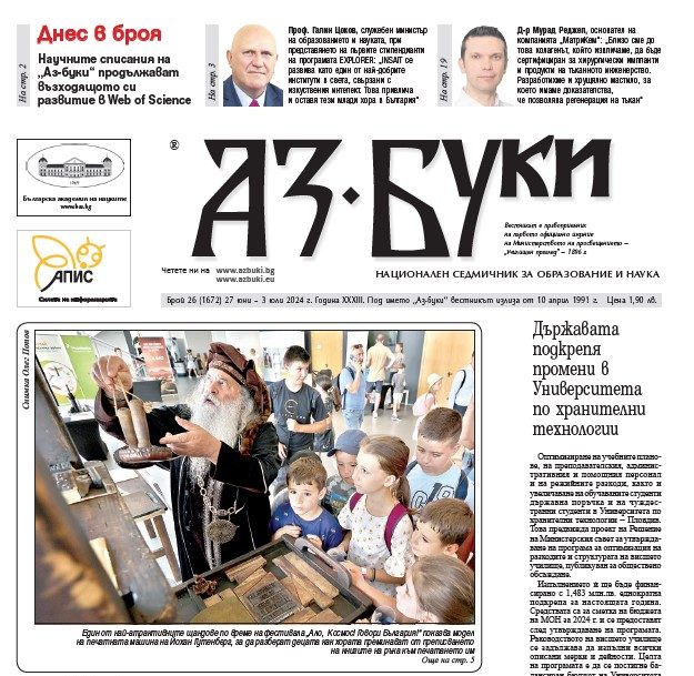 <h4><img class="size-medium wp-image-129282 alignleft" src="https://azbuki.bg/wp-content/uploads/2024/06/az-buki_26-2024-207x300.jpg" alt="" width="207" height="300" />Четете в новия брой:</h4> - Новият тип задачи не спъна десетокласниците - Научните списания на „Аз-буки“ с възходящо развитие в Web of Science: Това показва актуалният доклад на Journal Citation Reports за 2023 г. - 68% от учениците у нас чувстват подкрепа да мислят творчески - Родни таланти избират България: Осем са първите участници в стипендиантската програма на INSAIT и Факултета по математика и информатика на Софийския университет - Мисията на учителя е да открие таланта на всяко дете: За поредна година Национално издателство „Аз-буки“ връчи стипендия за отличен успех на ученик от ОУ „Васил Левски“ в село Караджово - „Ало, Космос!“ вдъхновява младите да мечтаят: Фестивалът събра над 1000 деца от цялата страна с интерес към науката - На чаша чай с родители: „Слънчева стая“ отвори врати в 3. ОУ „Д-р Петър Берон“ в Монтана - Бранд „51. средно училище“: Работата със семействата и интердисциплинарните уроци са сред ценностите, които педагозите в столичното школо следват - Вселена от идеи: Деца говорят с деца за наука в 100-годишното училище в Осойца - Актрисата и режисьор Яна Титова пред "Аз-буки": Основното нещо, което децата ни трябва да научат, е как да общуват, как да се впишат в обществото, как да имат мнение - „Едно, две, три – ела ме настигни“: Проект „Маргаритка“ вече 8 години радва малчуганите и помага на родителите в изграждането на навици у техните децата <a class="fp-embed" style="max-width: 100%;" href="https://73fc06f9.flowpaper.com/262024/" data-fp-width="400px" data-fp-height="300px">в. Аз-буки, бр. 26, 2024 г.</a><script async defer src="https://cdn-online.flowpaper.com/zine/3.8.2/js/embed.min.js"></script> <a href="https://azbuki.bg/wp-content/uploads/2024/newspaper/%D0%B2.%20%D0%90%D0%B7-%D0%B1%D1%83%D0%BA%D0%B8%2C%20%D0%B1%D1%80.%2026%2C%202024%20%D0%B3..pdf" target="_blank" rel="noopener">Изтеглете </a>броя на вашeто устройство.