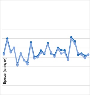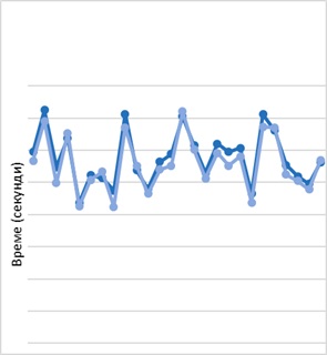 Фигура 1. Графика на времената за преплуване на 50 м кроул преди и след иновацията