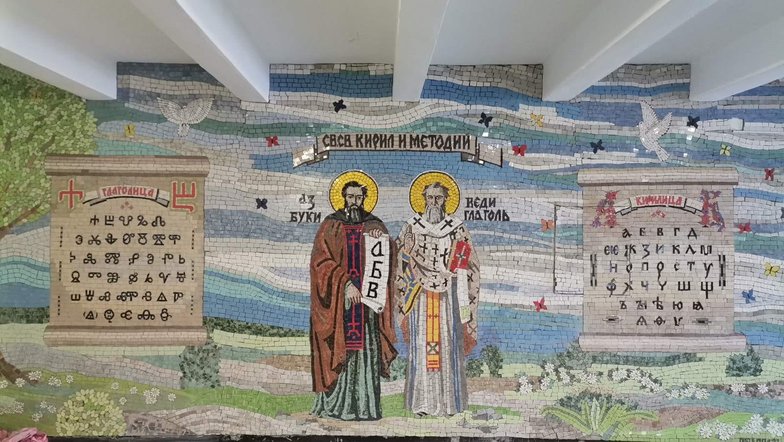 Огромна керамична мозайка радва ученици и преподаватели в ОУ „Св. св. Кирил и Методий“ – гр. Велики Преслав, Шуменско. Централен елемент от красивата композиция са Светите братя и двете азбуки – глаголицата и кирилицата. На стенната картина са изобразени още дървото – символ на познанието, и книгите, които го разпространяват. Автор на монументалната мозайка с размер 30 кв.м е Петя Мод, а замисълът е на директора на училището Стела Петрова.