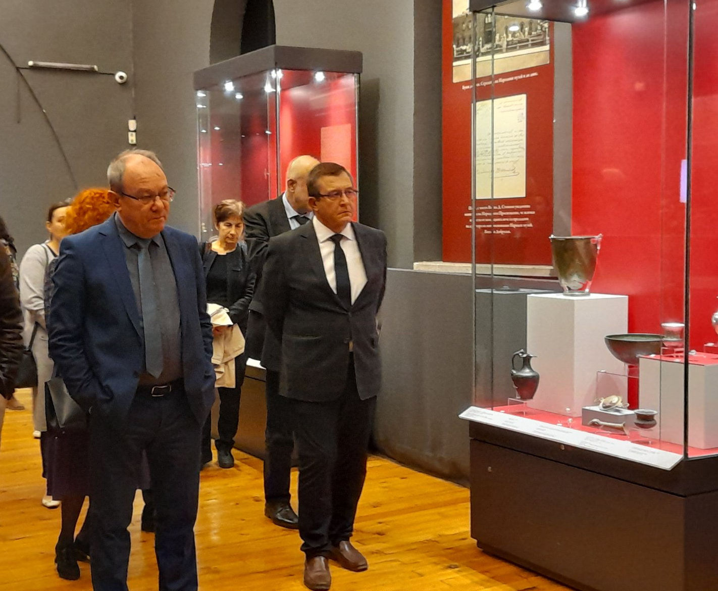 Министър Сашо Пенов (вдясно) и председателят на БАН акад. Юлиан Ревалски разгледаха юбилейната изложба в Археологическия музей