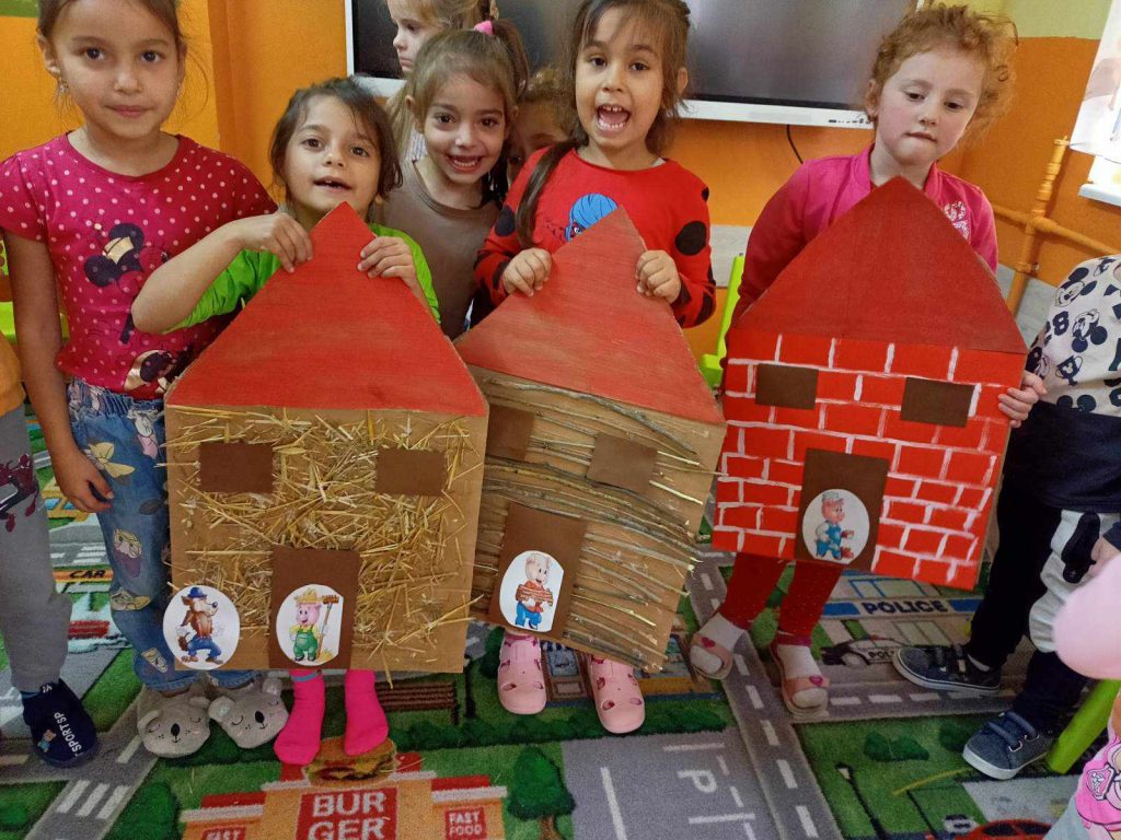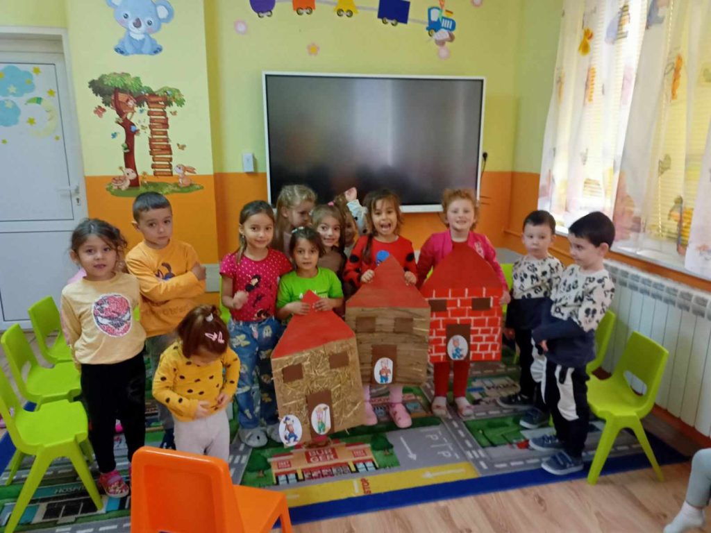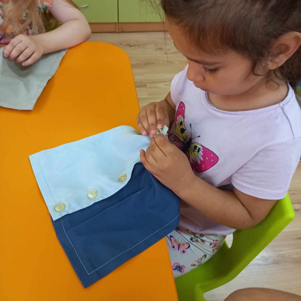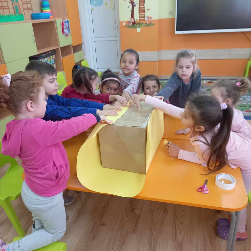 „В работата си използваме много природни материали“, разказва директорката. Често творят с листа, камъни, шишарки, кестени или пръчки. Освен това с достъпни материали от бита – сламки, пластмасови капачки и клечки се учат да пишат и броят. Наскоро правят знаме от капачки, които старателно оцветяват в цветовете на националния трибагреник. От картон пък решават да конструират робот, който досущ прилича на истински. С цифрите се запознават също благодарение на картон, от който правят кубчета.