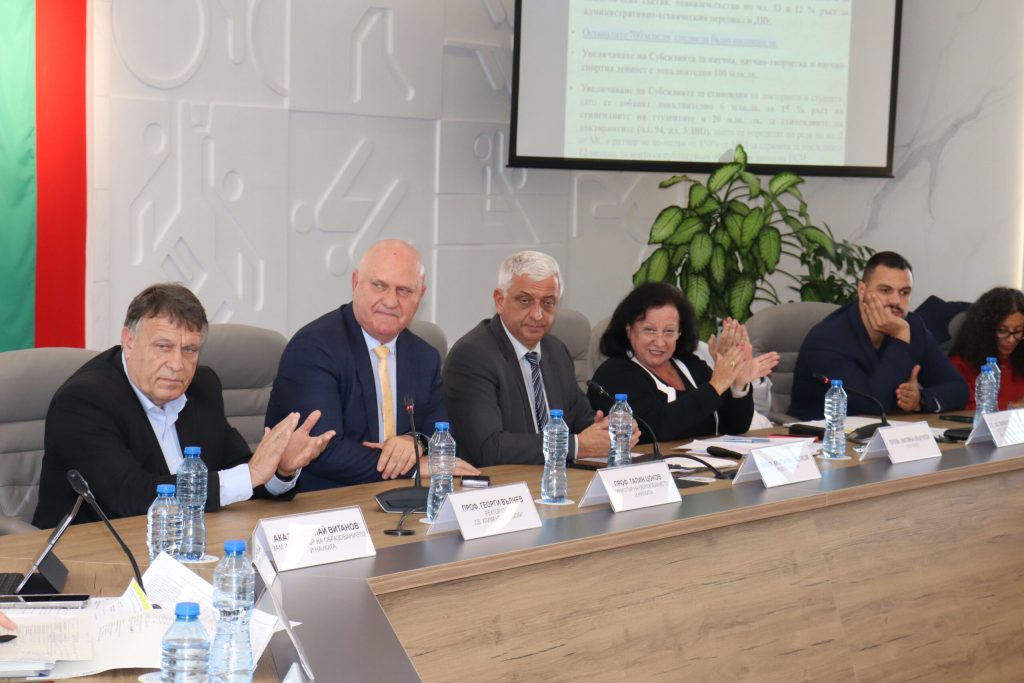 Теми на дискусията са положителните тенденции в политиката по доходи и оценки, финансирането при отчитане на реформи по критерии за качество и постигнати резултати, както и очакванията към Бюджет 2025 за държавните висши училища.