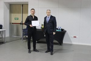 Чл.-кор. проф. Петър Петров с отличените участници в 16-ата научна сесия „Младите учени в света на полимерите“ Снимка Личен архив
