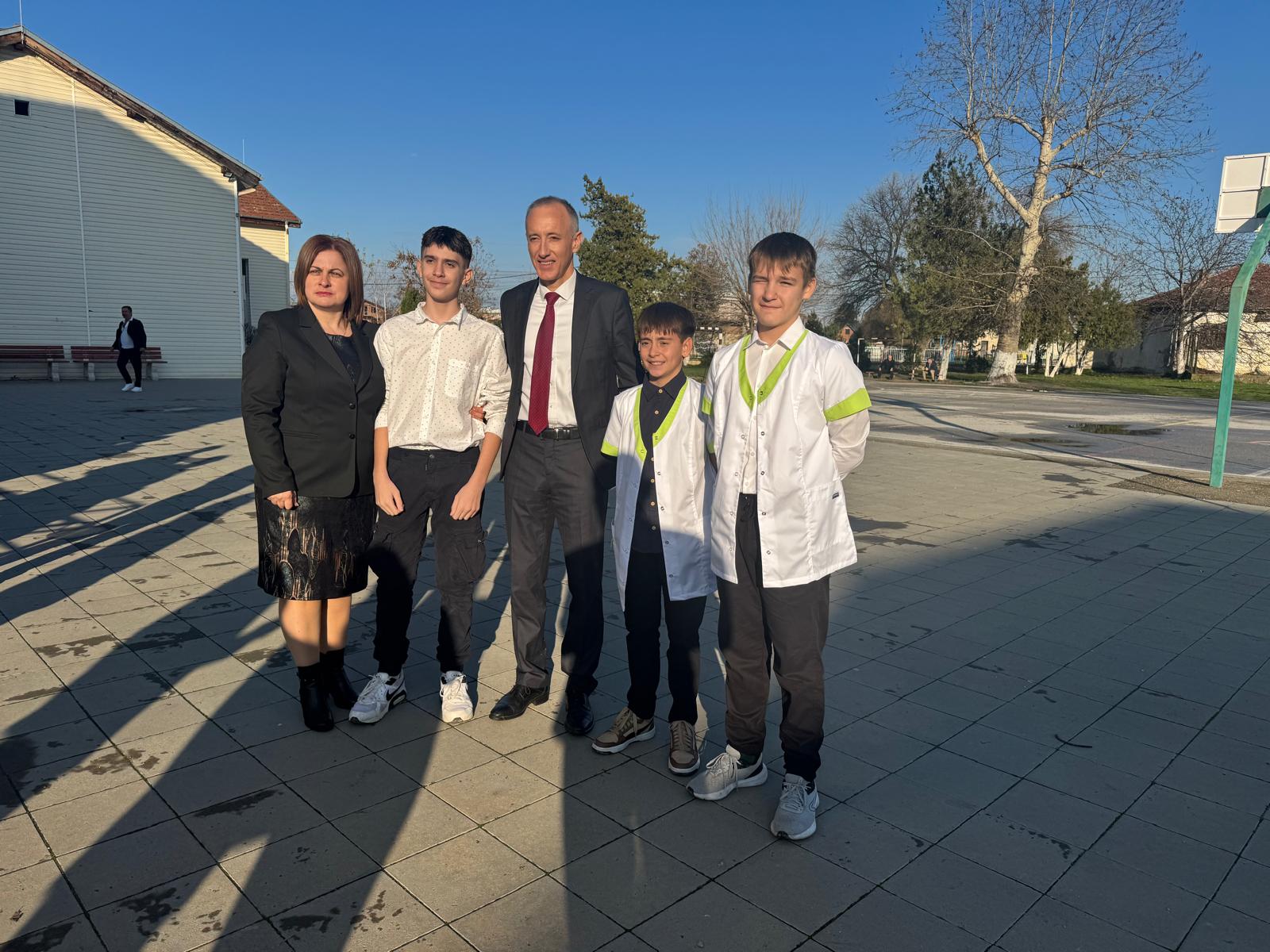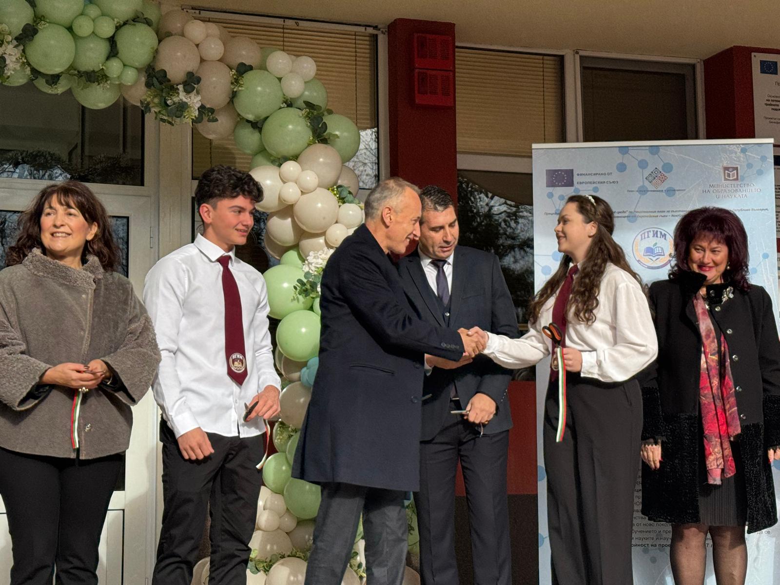 Министър Красимир Вълчев, който преди шест години е посещавал училището, поздрави директора за преобразената материална база.