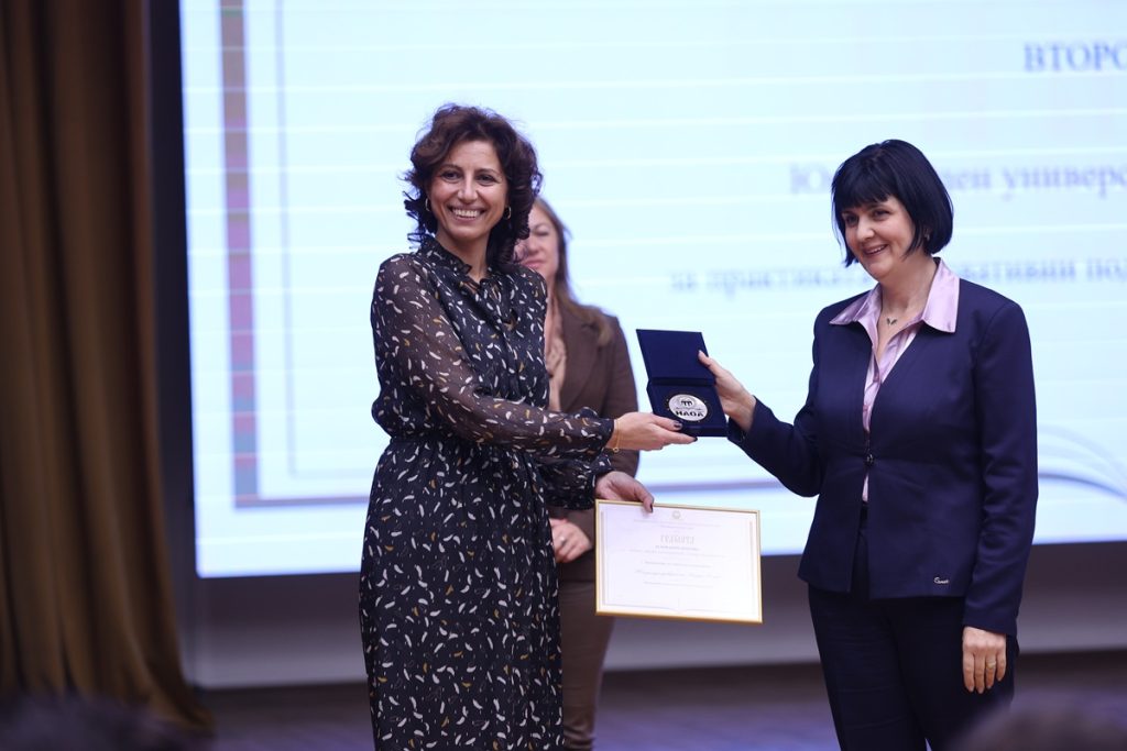 В категория „Практика за ангажиране на студенти и млади учени“ бе отличен  Югозападният университет за инициативата „Форум „Българска граматика“ и състезанието „Езикови майстори“. Наградата връчи доц. Николета Кузманова, заместник-председател на Народното събрание. Второ и трето място спечелиха практиката на УНСС – „Есенна академия“, и на Техническия университет в София – „Делова игра „Стажанти човешки ресурси“.