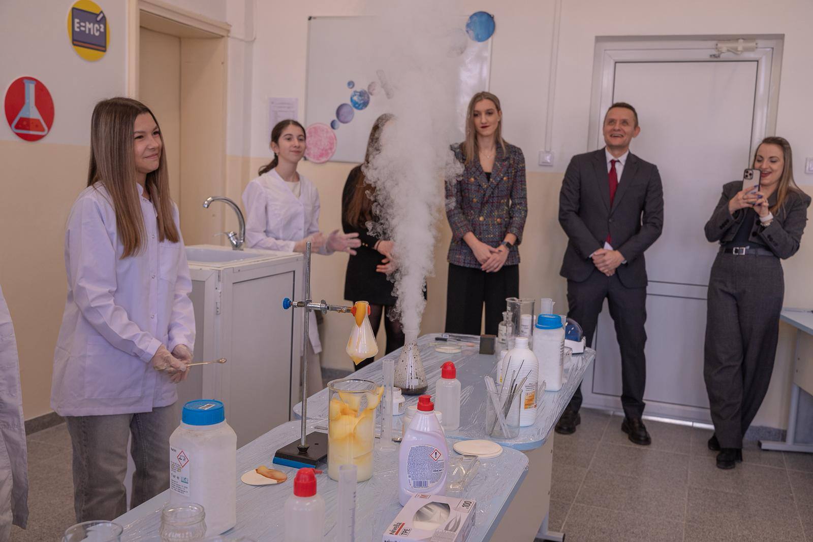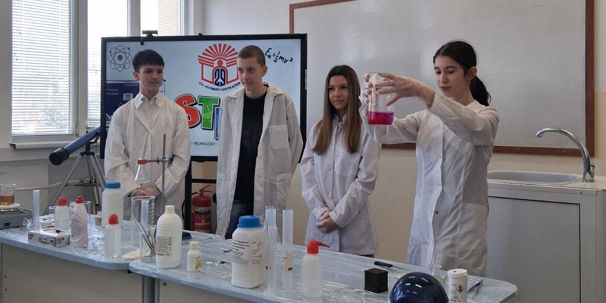 Още в първия ден от отварянето на STEM центъра учениците от прогимназиален и гимназиален етап влизат в ролята на изследователи – в открит урок в новите свързани кабинети те провеждат опити по химия, демонстрирайки дигитални умения и критично мислене.